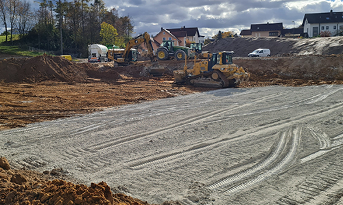 Wichtige infrastrukturelle Maßnahmen waren der Einbau von zwei Zisternen (DN 2500, je 15 m³), die Verlegung von etwa 50 m Stahlbetonleitungen und die Installation einer Flächendrainage (ca. 200 lfm), die das Regenwasser effizient ableitet. Ein stabiler Zaun sicherte die Baustelle, und eine provisorische Entwässerung gewährleistete die kontinuierliche Wasserableitung während der Bauphase.